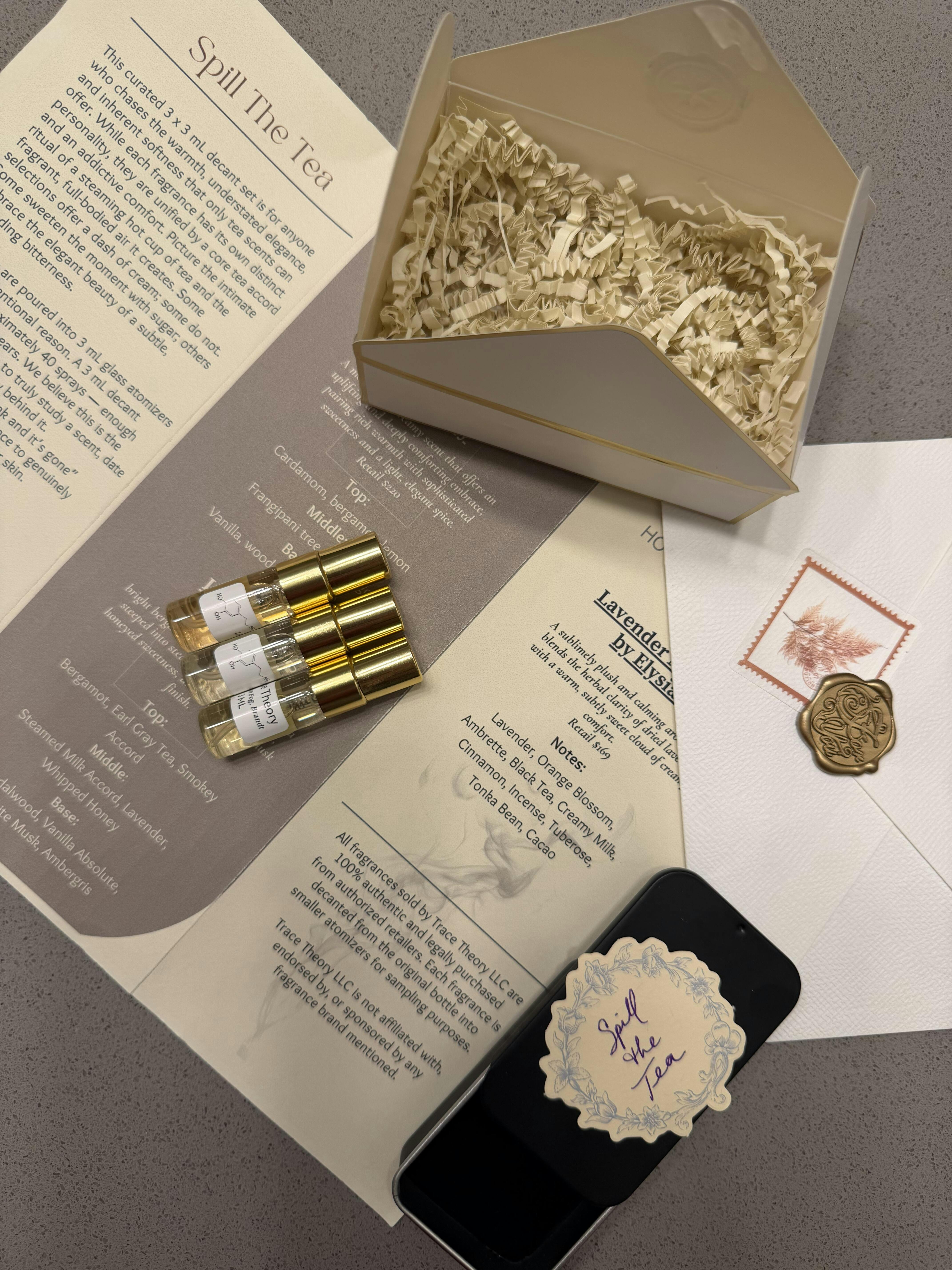 I enjoyed my ‘Spill the Tea’ set SO much and legitimately cannot wait to get my hands on another of the ‘Edits’ that Trace Theory has to offer. The package was delivered in a very timely manner, affordably and fairly priced, aesthetically pleasing, and I am intrigued by the curation of the scents themselves. It is very obvious how much effort, intention, and care goes into these decants, and I would recommend Trace Theory to anyone. Whether you want to experiment with new fragrances, enter this world at all, or find a truly lovely gift for a lover or friend, the Spill the Tea Edit is a wonderful choice. I can only assume that this would apply to everything else on the site as well!
